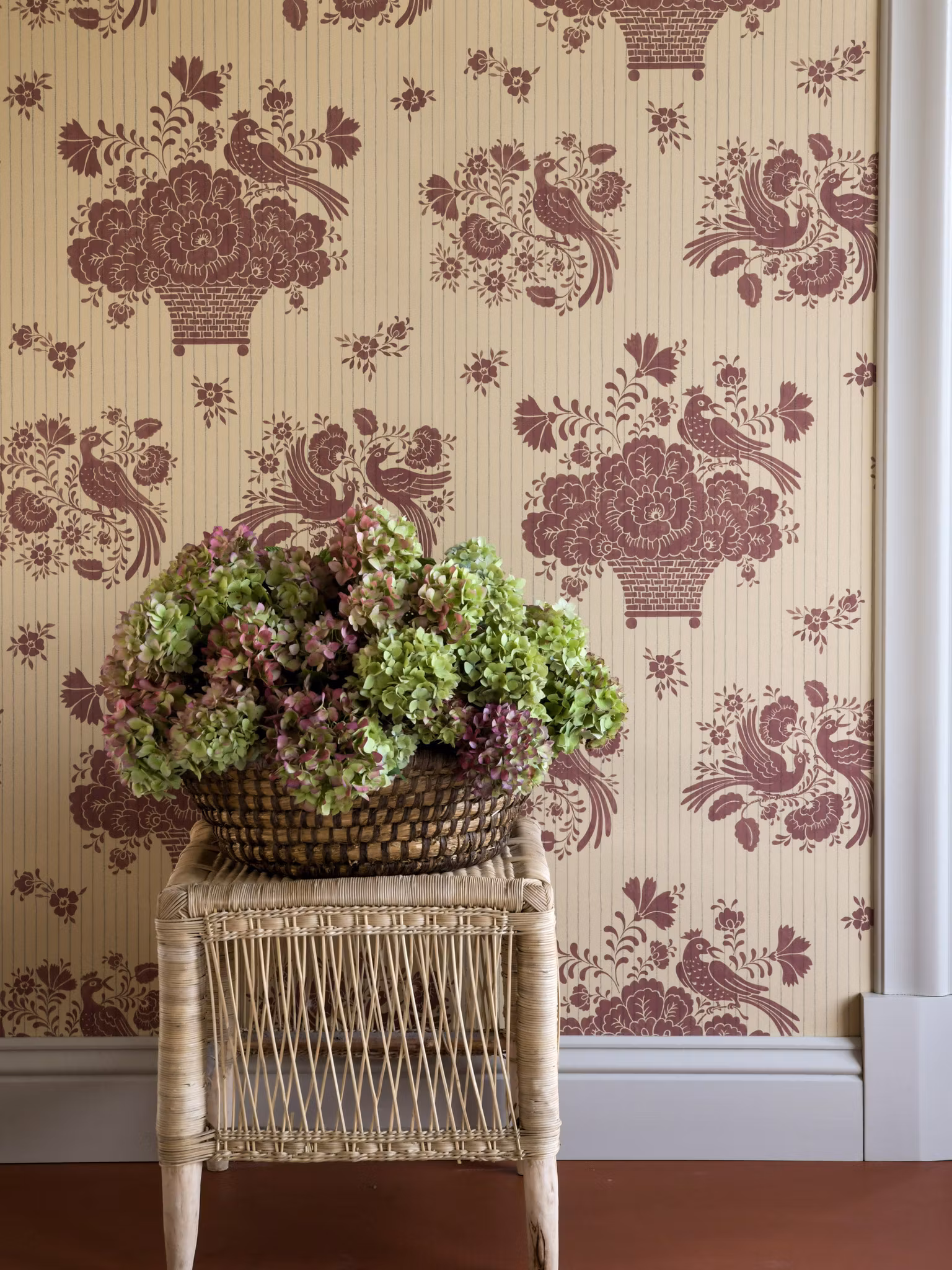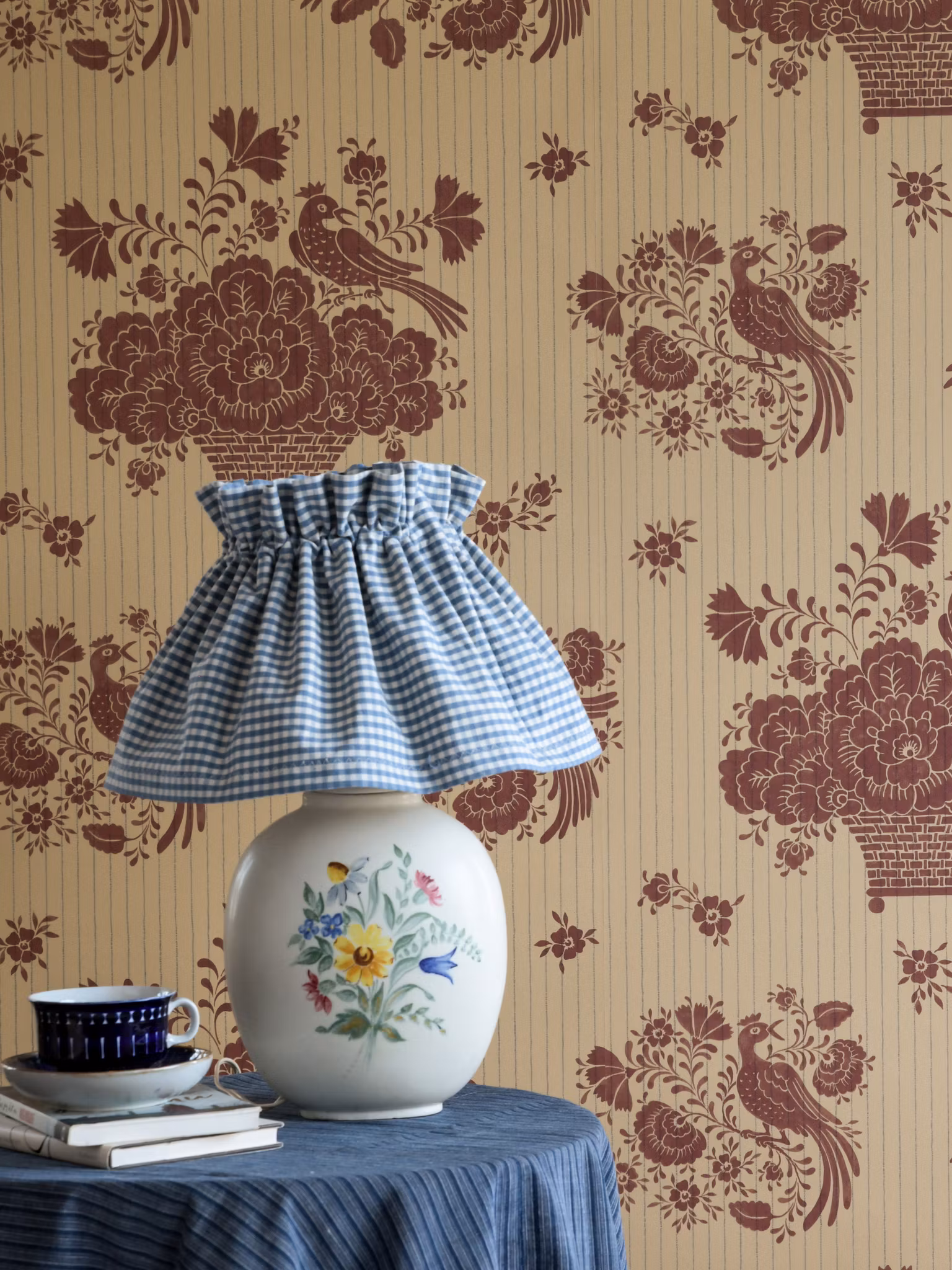 Kurbitsinspirerade fågelbon tryckta på en kritstrecksrand skapar en textil känsla. En eklektisk mix!Mönster: Birds NestFärg: Falu RedRapport: 64 cm Längd: