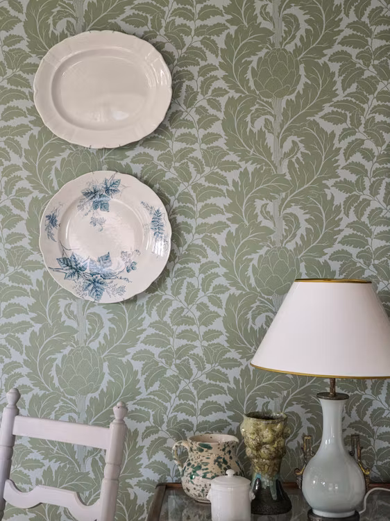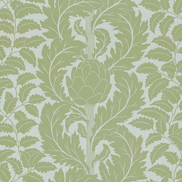 Mönster: Artichoke Färg: Garden green Rapport: 53 cm Längd: 10,05 m Mönsterpass: förskjuten Material: non-voven Designer: Emma von Bröm