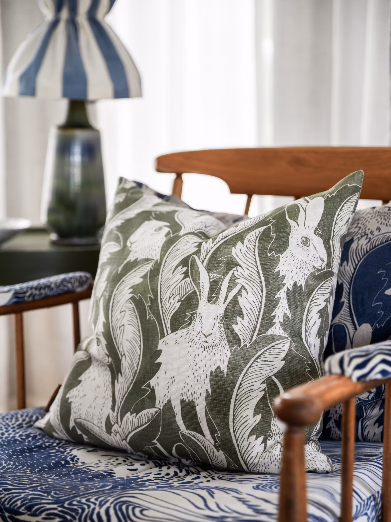 In the pattern "Hares in Hiding", mysterious and curious hares are concealed among cabbage leaves. The inspiration comes from fables and fairy tales where animals are characters in a dramatic narrative. "Hares in Hiding" is one of Emma’s most beloved patterns and adorns beautiful homes as wallpaper, handcrafted by Ulricehamns Tapetfabrik.